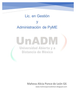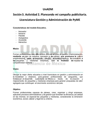 Este documento presenta la información sobre la Licenciatura en Gestión y Administración de PyME de UnADM. Describe las características del modelo educativo como innovador, inclusivo y flexible. Explica la misión, visión y objetivo del programa, así como el perfil del egresado y áreas de trabajo. Finalmente, discute el impacto que tendrá este programa en México al ayudar a las PyMEs a crecer y reducir su alta tasa de mortalidad a través de egresados altamente capacitados.