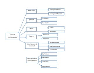 Este documento describe diferentes tipos de investigación, incluyendo investigación básica vs aplicada, cualitativa vs cuantitativa, y estudios de campo, documentales, diacrónicos y sincrónicos. También cubre diseños de investigación como no experimental, cuasi experimental y experimental, así como propósitos como exploratorio, descriptivo, explicativo y correlacional. Finalmente, resume las etapas del proceso de investigación como planteamiento del problema, modelo teórico, deducción de hipótesis, recolección y análisis de datos, y comparación de conclusiones con la