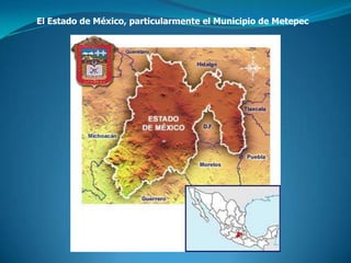 Este documento describe la importancia económica del municipio de Metepec en el estado de México. Metepec tiene una economía diversificada basada en la industria, el turismo y la agricultura. La industria de la construcción y los centros comerciales han impulsado el crecimiento económico. Metepec tiene un alto PIB per cápita en comparación con Toluca y México debido a la inversión extranjera. La agricultura, ganadería e industria de artesanías de barro también son importantes para la economía local