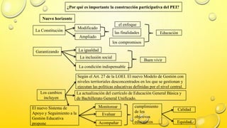 Este documento proporciona una guía metodológica para la construcción participativa del Proyecto Educativo Institucional (PEI). Explica que el PEI es un proceso de reflexión y acción estratégica de la comunidad educativa que orienta las decisiones de la institución. Detalla las tres condiciones necesarias para su construcción participativa: conformar un equipo gestor, establecer acuerdos con la comunidad educativa, y organizar de forma conjunta el plan de trabajo. Además, resalta la importancia de definir la identidad instituc