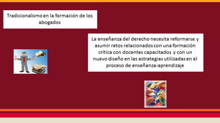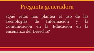 Este documento discute los retos que plantea el uso de las tecnologías de la información y la comunicación (TIC) en la enseñanza del derecho. Explica que las TIC deben usarse como herramientas de apoyo para enriquecer y complementar, pero no reemplazar, los métodos de enseñanza convencionales. Concluye que tanto profesores como estudiantes deben capacitarse en el uso de las TIC y que éstas pueden ayudar a desarrollar habilidades como el pensamiento crítico en los estudiantes de dere