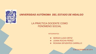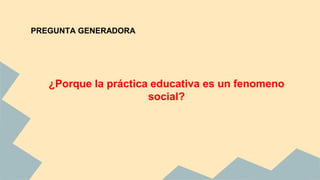 La práctica docente es un fenómeno social complejo que se ve influenciado por el contexto social y la institución escolar. La escuela formaliza las relaciones entre maestros y estudiantes y transmite valores a la comunidad. Para entender plenamente la práctica docente es necesario analizarla desde las perspectivas de los docentes y dentro del marco histórico y social en el que ocurre, ya que múltiples factores influyen en ella.