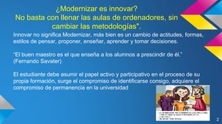 El documento discute la importancia de la innovación docente en la educación superior, enfatizando que innovar implica un cambio de actitudes y metodologías más que solo modernizar el equipamiento. Se destaca el papel activo del estudiante en su aprendizaje y la necesidad de que los docentes adopten nuevas estrategias y tecnologías para mejorar su enseñanza. En conclusión, se requiere una educación continua y nuevas formas de vinculación entre la universidad y la sociedad para desarrollar competencias en los estudiantes.