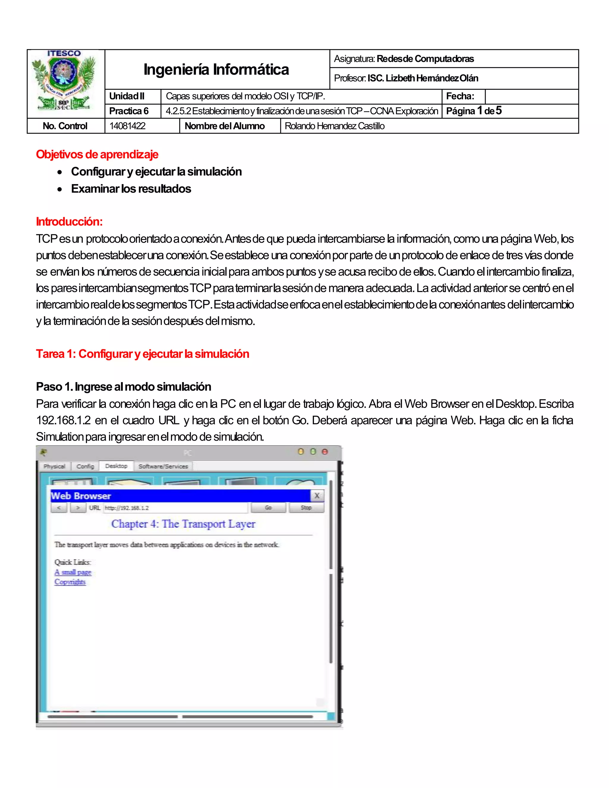 El documento describe una práctica de simulación sobre la conexión y finalización de sesiones TCP en el contexto del modelo OSI y TCP/IP. Se detallan los pasos para configurar la simulación, ejecutar la captura de eventos TCP y examinar los resultados de la sesión. Se enfatiza el proceso de establecimiento de conexión y la terminación adecuada de la misma al intercambiar segmentos TCP.