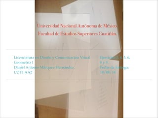 El documento presenta los ejercicios 3, 4, 5, 6, 8 y 9 de la asignatura de Geometría I para la Licenciatura en Diseño y Comunicación Visual de la Universidad Nacional Autónoma de México. Incluye la fecha de entrega de los ejercicios, que es el 18 de agosto de 2014.