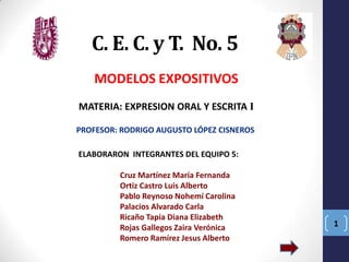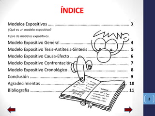 El documento explora diversos modelos expositivos, que son estructuras para presentar información de manera clara y efectiva. Se describen cinco tipos de modelos: general, tesis-antítesis-síntesis, causa-efecto, confrontación y cronológico, cada uno con características y ejemplos distintos. La conclusión destaca la importancia de elegir el modelo adecuado para facilitar la comprensión del tema por parte del público.