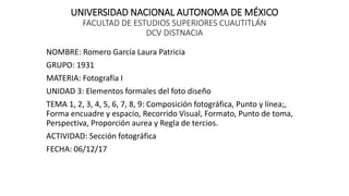 El documento presenta una lista de los temas cubiertos en la unidad 3 de la materia Fotografía I para la estudiante Laura Patricia Romero García. Los temas incluyen conceptos fundamentales de composición fotográfica como punto y línea, encuadre, recorrido visual, formato, punto de toma, perspectiva, proporción áurea y regla de los tercios.
