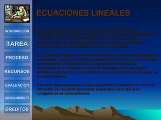 Este documento presenta una guía para enseñar ecuaciones lineales a través de un enfoque de aprendizaje cooperativo. Los estudiantes se dividen en equipos para estudiar diferentes temas relacionados con las ecuaciones lineales y luego comparten lo que aprendieron. La guía incluye tareas, recursos, evaluaciones y conclusiones para cada equipo.