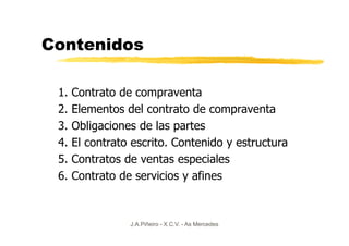 Este documento resume los elementos clave del contrato de compraventa. Explica que un contrato de compraventa implica a un comprador y un vendedor, un objeto a vender y un precio acordado. Detalla las obligaciones de cada parte, como la obligación del vendedor de entregar el objeto y del comprador de pagar el precio. El documento también cubre temas como los requisitos para que un contrato sea válido y los tipos de compraventa civil y mercantil.