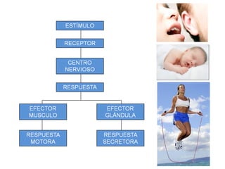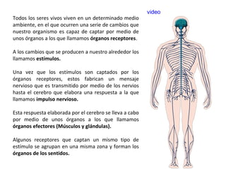 El documento describe el funcionamiento del sistema nervioso y los sentidos. Explica que los estímulos son captados por los órganos receptores y transmitidos como impulsos nerviosos al cerebro, que elabora una respuesta que se lleva a cabo por los órganos efectores. También describe las partes del sistema nervioso, como el cerebro, la médula espinal y las neuronas, y cómo estas se comunican a través de sinapsis para transmitir los impulsos nerviosos.