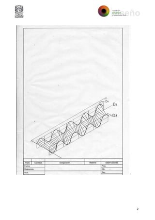 El documento instruye al estudiante a construir dos figuras geométricas: 1) una superficie reglada de tres directrices con velocidad de avance constante en la directriz central y 2) un hiperboloide elíptico. El estudiante debe dibujar los bocetos, trazar exactamente la primera figura, modelar la segunda en 3D, y presentar ambas en una presentación digital con descripciones.