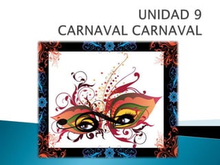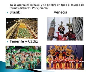 El documento describe las tradiciones del carnaval en diferentes partes del mundo como Brasil, Tenerife y Cádiz. En Brasil, la samba se baila durante las fiestas y se encuentran batucadas en las calles de Río de Janeiro. Tanto en Tenerife como en Brasil hay desfiles con ritmos como la samba y la elección de una reina. El carnaval de Cádiz se caracteriza por agrupaciones vocales como la chirigota y la comparsa.