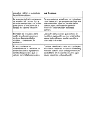 El documento discute conceptos clave relacionados con la evaluación educativa. Señala que la evaluación sirve para rendir cuentas, planificar y tomar decisiones para mejorar la educación. También destaca la importancia de considerar las problemáticas y avances educativos, así como lograr coherencia entre los componentes internos y externos del sistema educativo para alcanzar los objetivos. Además, menciona que la selección de indicadores educativos debe basarse en su potencial, claridad y rigor para apoyar la evaluación de calidad.