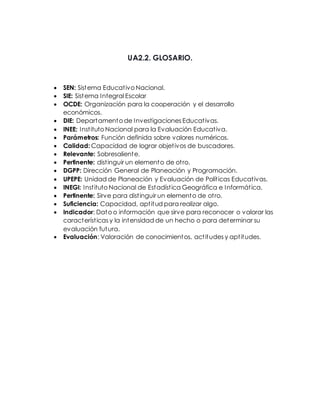 Este documento presenta un glosario de términos clave relacionados con la educación y la evaluación educativa. Define términos como Sistema Educativo Nacional, Organización para la Cooperación y el Desarrollo Económicos, Instituto Nacional para la Evaluación Educativa, calidad, indicador y evaluación.