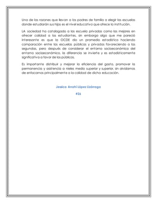 Este documento resume los principales hallazgos de México en términos de indicadores educativos desde la perspectiva de la OCDE. Destaca que México ha logrado una participación educativa casi universal para niños de 5 a 14 años, pero muchos no concluyen la educación superior. El principal reto es mantener a los estudiantes en la escuela a niveles medio superior y superior. A pesar de tener un alto gasto educativo, la distribución por estudiante muestra áreas de oportunidad, especialmente en mejorar la calidad de la educación.