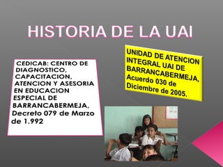 El CEDICAB se creó en 1991 para atender a la población con necesidades educativas especiales en Barrancabermeja. Inició con dos aulas para sordos en 1994 que luego se integraron al aula regular en 1995, aunque los resultados no fueron los esperados. En 1997 se crearon unidades de atención integral en varias zonas de la ciudad para atender a la población con discapacidad escolarizada y no escolarizada. A partir de 2003, estas unidades empezaron a trasladarse a las instituciones educativas y el enfoque cambió a instituc