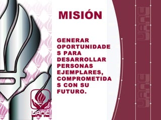Este documento presenta la misión y valores de una universidad, así como los diferentes programas de bachillerato, becas y actividades deportivas, culturales y servicios que ofrece. La misión es generar oportunidades para desarrollar personas comprometidas con su futuro a través de valores como la honestidad, responsabilidad, desarrollo humano y servicio. Se describen cuatro programas de bachillerato de dos o tres años con diferentes enfoques, así como criterios para becas de excelencia y servicio.