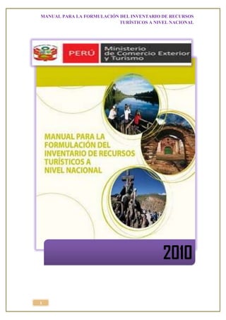 Este documento presenta las fases y objetivos de la elaboración de un inventario de recursos turísticos a nivel nacional en Perú. La Fase I describe la categorización de los recursos, que incluye objetivos como lograr uniformidad en los criterios de evaluación y conocer sistemáticamente el patrimonio turístico. Luego presenta conceptos como el inventario y sus objetivos, así como los tipos de ámbitos territoriales de estudio.