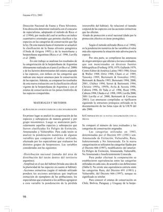 Este documento resume los resultados de la evaluación más reciente del estado de conservación de los anfibios y reptiles de Argentina. De los 484 taxa evaluados, el 23% se encuentra en categorías de amenaza como En Peligro de Extinción, Amenazada o Vulnerable. Los anfibios tienen una proporción mayor (31.6%) en estas categorías en comparación con los reptiles (19.2%). La mayoría de las especies amenazadas tienen distribuciones restringidas, especialización en el hábitat, baja protección y están sujetas a acciones humanas extractivas como el