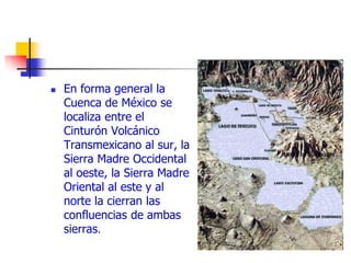 La Cuenca de México se localiza entre varias cadenas montañosas y está compuesta de cuatro valles principales, incluyendo el Valle de México al sur. La cuenca también contiene varios lagos como el Lago de Texcoco, Lago de Xochimilco, y Lago de Chalco.