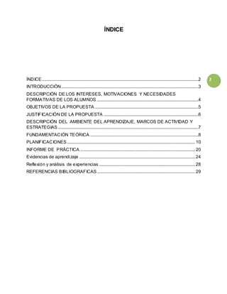 Este documento presenta una propuesta educativa sobre el tema de la ubicación espacial para un grupo de 14 estudiantes de segundo año de preescolar. La propuesta busca desarrollar actividades lúdicas que ayuden a los estudiantes a reconocer conceptos como izquierda, derecha, arriba, abajo, delante y detrás. El documento incluye una descripción de los estudiantes, los objetivos de la propuesta, su justificación y las estrategias y planificaciones propuestas.