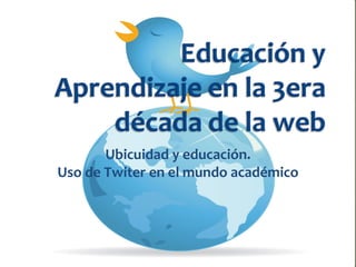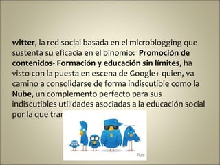 El documento discute el uso creciente de Twitter en el ámbito académico y educativo. Explica que Twitter, al igual que la nube, se ha convertido en una herramienta complementaria para la educación social y permite el aprendizaje constante sin límites. También describe cómo las redes sociales como Twitter han cambiado las estructuras cerebrales de los menores, haciéndolos nativos digitales que necesitan la interacción social. El documento concluye resaltando que Twitter, debido a su inmediatez, dinamismo y capacidad para
