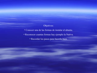 Este documento describe dos métodos para instalar Ubuntu: de forma nativa quemando la imagen ISO en un CD/DVD y reiniciando la PC con el disco, o en una máquina virtual usando VirtualBox. Explica los pasos para cada método, como seleccionar el idioma, particionar el disco, completar los detalles personales, e instalar el sistema. Finalmente, indica que en la próxima guía explicará cómo instalar GuestAdditions para compartir carpetas entre sistemas.