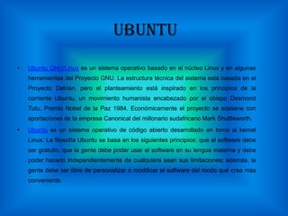 Ubuntu es un sistema operativo de código abierto basado en Linux. Su filosofía se basa en que el software debe ser gratuito, accesible para todos independientemente de limitaciones, y que la gente puede personalizarlo. Existe en varias versiones como Ubuntu, Kubuntu y Edubuntu que usan interfaces gráficos diferentes, y versiones para escritorio, servidores y alternativas de instalación.