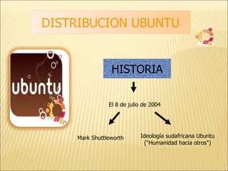 Este documento proporciona una introducción a la distribución Ubuntu de Linux. Explica que Ubuntu fue creada en 2004 y se basa en los principios de Ubuntu de "humanidad hacia otros". Describe algunas de las características clave de Ubuntu como su soporte para diferentes arquitecturas de hardware, actualizaciones de paquetes y traducciones a más de 130 idiomas. También resume algunas de las aplicaciones incluidas como Firefox, Evolution y OpenOffice, así como los componentes para la organización de paquetes y el soporte a largo plazo para versiones.