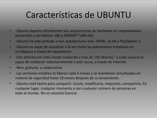 Ubuntu es una distribución de Linux libre y gratuita que soporta arquitecturas x86 y AMD64. Se actualiza a través de repositorios y está traducido a más de 130 idiomas. Sus versiones estables se lanzan cada 6 meses y reciben soporte de 18 meses. Existe una gran variedad de versiones derivadas como Kubuntu, Xubuntu y Edubuntu. La instalación implica seleccionar idioma, zona horaria, teclado, partición y revisar los datos antes de comenzar la instalación propiamente dicha.