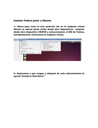 Este documento proporciona instrucciones en 15 pasos para instalar Fedora junto a Ubuntu en una máquina virtual. Primero se selecciona el ISO de Fedora y se reinicia la máquina virtual para iniciar la instalación. Luego se configura el idioma, fecha, hora y partición de destino para Fedora. Finalmente se asigna una contraseña root, se completa la instalación y se reinicia la máquina virtual para poder seleccionar entre Ubuntu o Fedora al iniciar.