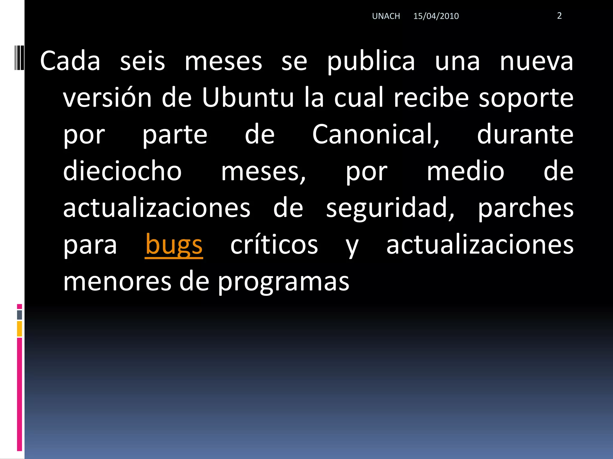 Ubuntu es un sistema operativo de código abierto que se actualiza cada seis meses. Ofrece soporte durante 18 meses y se enfoca en facilidad de uso. Incluye software libre y ha sido traducido a más de 130 idiomas. Existen variantes como Kubuntu y Xubuntu diseñadas para entornos específicos.