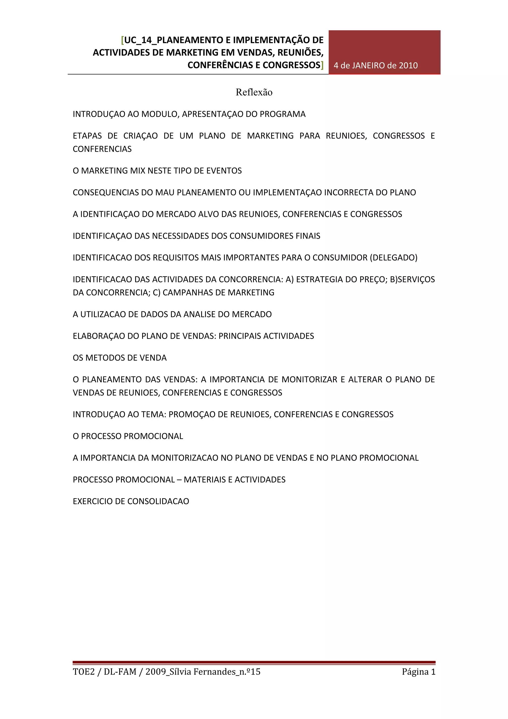 ACTIVIDADES DE MARKETING EM VENDAS, REUNIÕES,