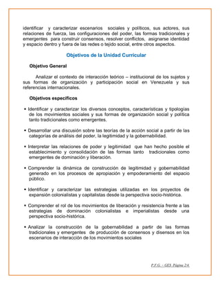 Este documento describe una unidad curricular sobre sujetos y formas de organización y participación social en el contexto de la gestión del desarrollo local. La unidad tiene como objetivo analizar el contexto teórico e institucional de los sujetos sociales y sus formas de organización en Venezuela y a nivel internacional. La unidad también busca comprender los ciclos de vida de los movimientos sociales y sus roles en la participación social a través de un análisis socio-histórico. Se proporciona una bibliografía relevante para apoyar los contenidos