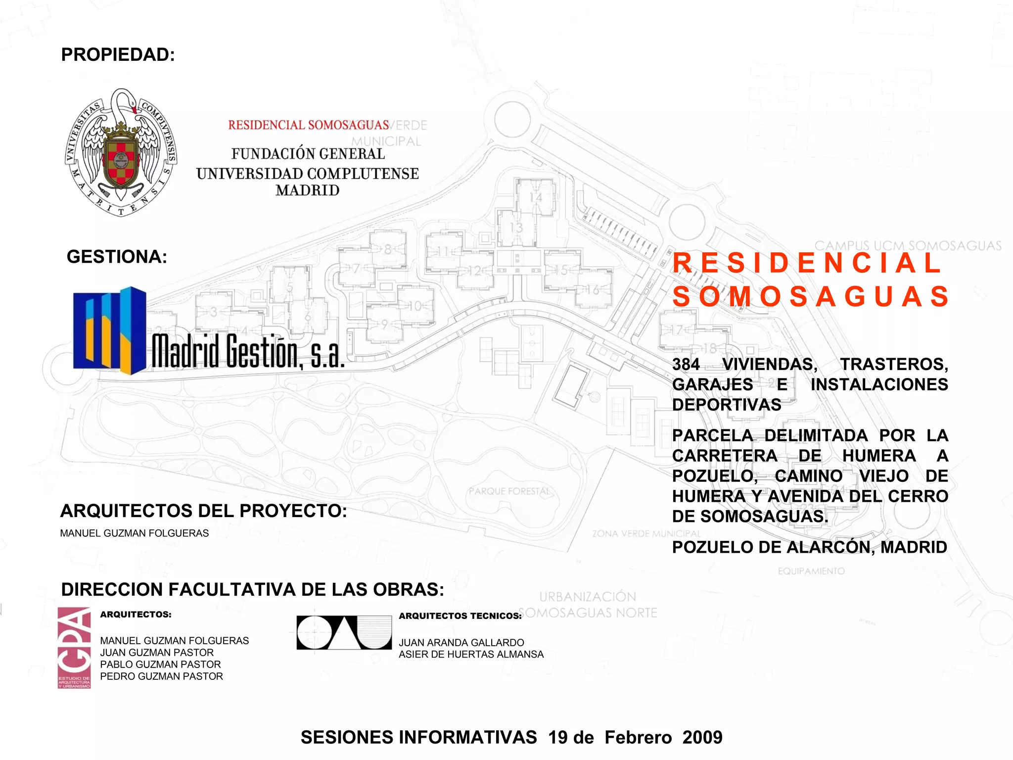 Este documento presenta un proyecto residencial de 384 viviendas, trasteros y garajes, así como instalaciones deportivas en Pozuelo de Alarcón, Madrid. Incluye información sobre la promoción, el plan de viabilidad económica, comentarios sobre el proyecto arquitectónico y especificaciones técnicas de las viviendas.