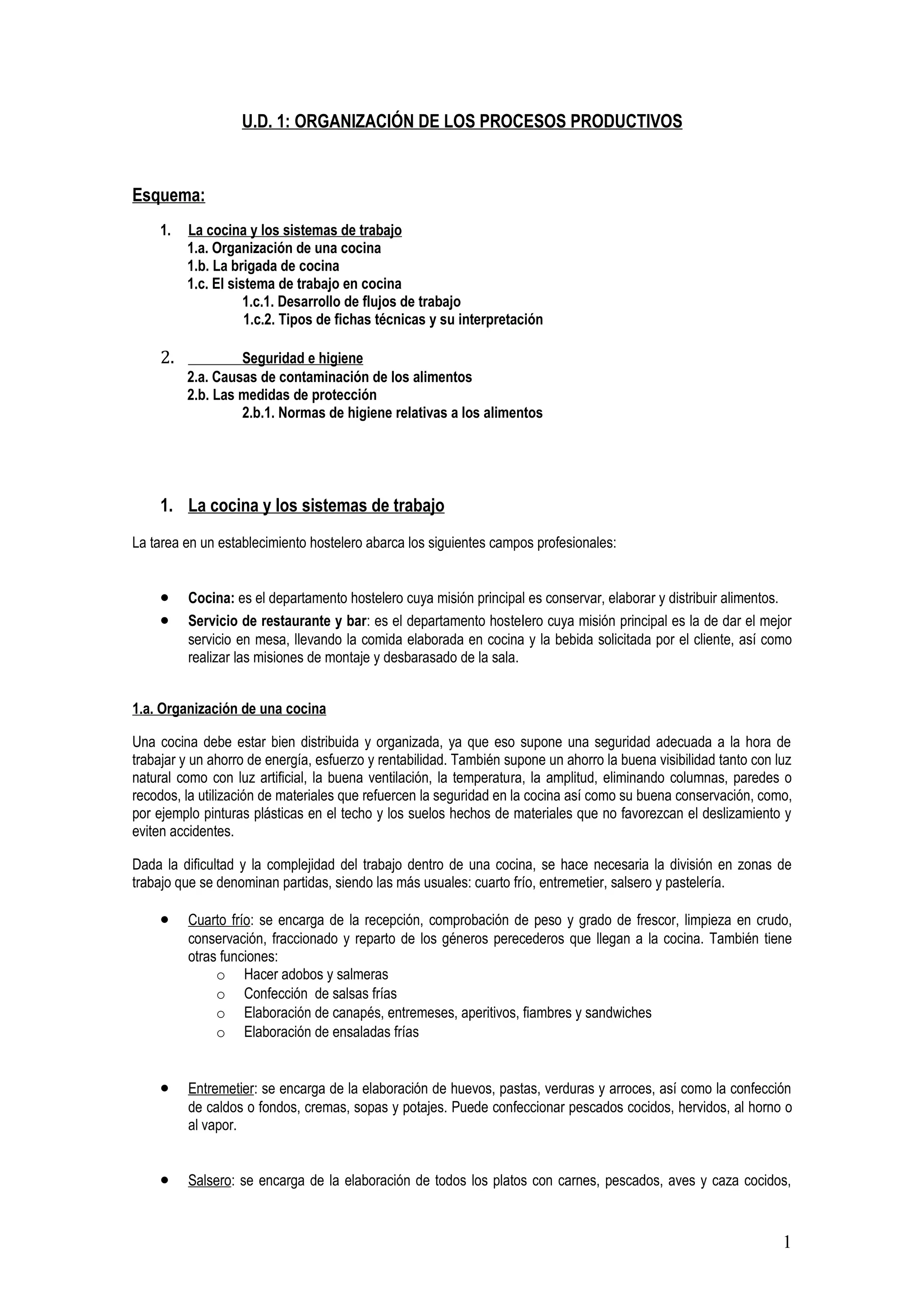 La organización de los procesos productivos en la cocina incluye la organización de la cocina en zonas de trabajo como el cuarto frío, entremetier, salsero y pastelería. También se describe la brigada de cocina y sus roles. El sistema de trabajo en la cocina requiere preelaboración de alimentos, puesta a punto de los elementos necesarios, y elaboración de platos siguiendo el flujo de trabajo establecido. La seguridad e higiene son fundamentales mediante medidas para proteger los alimentos de la contaminación.