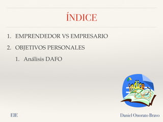 El documento presenta información sobre el emprendimiento y la iniciativa emprendedora. Explica la diferencia entre emprendedor y empresario, e introduce los conceptos de objetivos personales y análisis DAFO. Además, incluye actividades para los estudiantes sobre cualidades de los emprendedores, tipos de emprendedores, y habilidades personales.