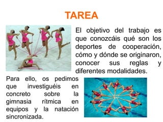 El documento pide a los estudiantes investigar los deportes de cooperación de gimnasia rítmica en equipos y natación sincronizada. Deben definir los deportes colectivos de cooperación, e incluir las características, aspectos reglamentarios, modalidades y deportistas destacados de cada deporte. Finalmente deben escribir una conclusión sobre lo que han aprendido y añadir los nombres de los miembros del grupo al final.