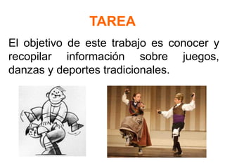 Este documento proporciona instrucciones para un proyecto escolar sobre los juegos, danzas y deportes tradicionales que jugaban los abuelos. El objetivo es conocer y recopilar información sobre estas actividades del pasado. El proceso implica incluir un título, la descripción de dos juegos de los propios abuelos, dos juegos típicos de dos comunidades autónomas españolas y dos juegos de países diferentes, así como una conclusión sobre lo que se ha aprendido y los nombres de los miembros del grupo