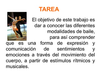 El documento describe una tarea escolar para crear un mural que presente diferentes modalidades de baile. Los estudiantes deben incluir el título, definir e incluir fotos de 5-7 modalidades de baile con su país de origen, y concluir reflexionando sobre lo que han aprendido. Deben añadir sus nombres en el borde inferior derecho del mural, ordenados alfabéticamente por el primer apellido.
