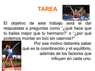 Este documento proporciona instrucciones para un proyecto escolar sobre la coordinación y el equilibrio. El objetivo es responder preguntas sobre por qué algunas personas son mejores en actividades como montar en bicicleta o bailar. Los estudiantes deben definir la coordinación y el equilibrio, enumerar los factores que influyen en cada uno, e incluir ejemplos de juegos para practicar estas habilidades motrices. El proyecto debe incluir un título, conclusiones y los nombres de los miembros del grupo ordenados alfabéticamente.