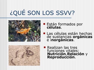 El documento proporciona una introducción general sobre los seres vivos. Explica que los seres vivos están compuestos de células, las cuales realizan funciones vitales como la nutrición, relación y reproducción. Detalla los cinco reinos en los que se clasifican los seres vivos y ofrece ejemplos de tamaños relativos de diferentes entidades biológicas y químicas. También resume la composición química básica de los seres vivos y los procesos de nutrición, metabolismo y reproducción celular.