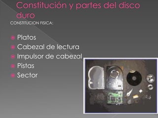 El documento describe los componentes físicos de un disco duro, incluyendo platos, cabezales de lectura, impulsores de cabezal y pistas. Explica que el formateo físico define el tamaño y ubicación de los sectores en el disco duro durante su fabricación, mientras que el formateo lógico elimina la información de asignación de archivos para liberar espacio. También compara los sistemas de archivos FAT16, FAT32 y NTFS en términos de su capacidad para admitir tamaños de archivo mayores