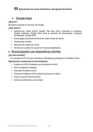 Este documento describe las principales aplicaciones de correo electrónico y agenda electrónica. Explica que Gmail es un popular servicio de correo que ofrece gran capacidad de almacenamiento y protección contra spam y virus. También describe a Microsoft Outlook como una completa agenda electrónica que permite gestionar correo, contactos, calendario y tareas. Además, señala que Google Apps ofrece servicios como Gmail, Google Calendar y Google Docs con almacenamiento ilimitado y acceso desde dispositivos móviles.