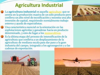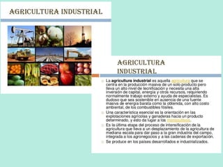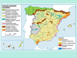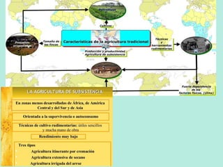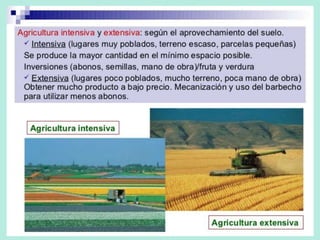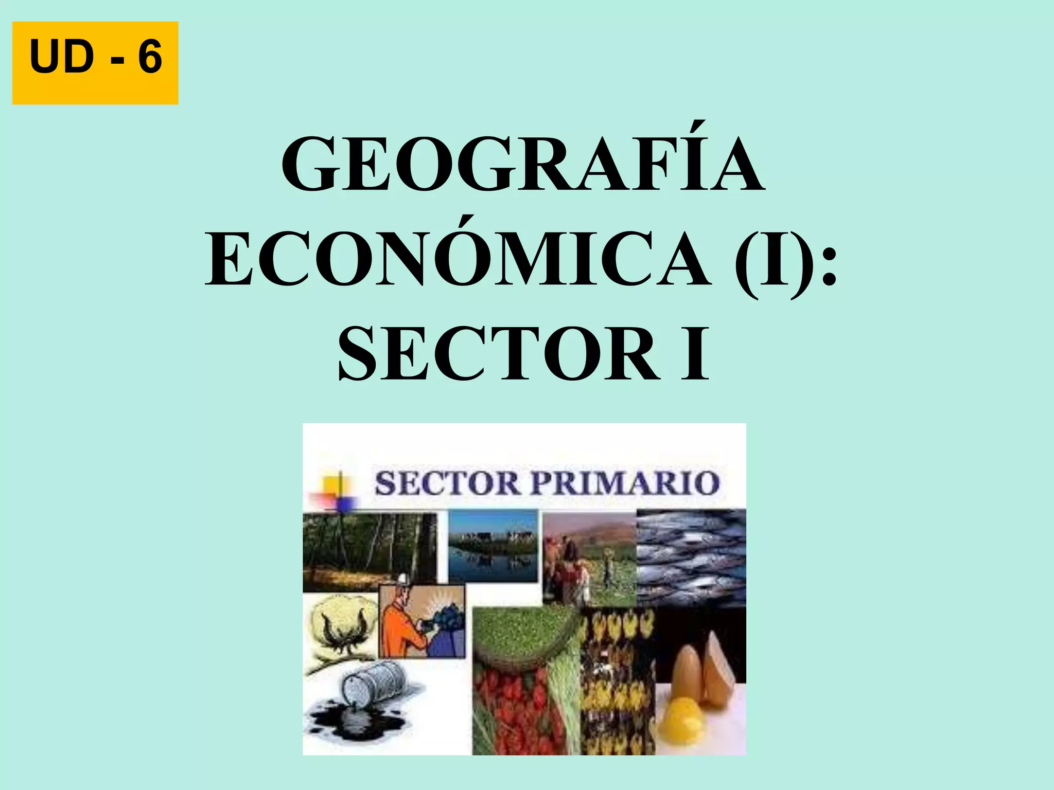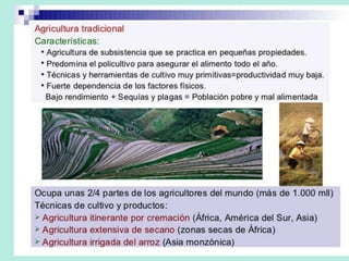 Este documento describe los diferentes sectores económicos, incluyendo el sector primario, secundario y terciario. En el sector primario, se detalla la agricultura, ganadería, silvicultura y pesca. Se explican los diferentes tipos de agricultura e incluyen factores que afectan la actividad agraria como el clima, suelo y relieve. También se analizan los sistemas agrarios en diferentes partes del mundo.