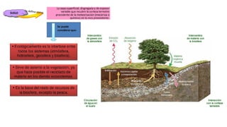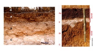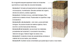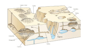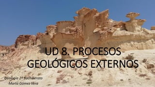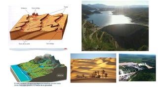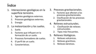 Este documento describe los procesos geológicos externos que ocurren en la superficie terrestre. Explica los agentes geológicos externos como la atmósfera, hidrosfera y biosfera. Describe procesos como la meteorización, erosión, transporte y sedimentación. También habla sobre la formación de suelos y los factores que influyen en ella, así como los procesos gravitacionales.