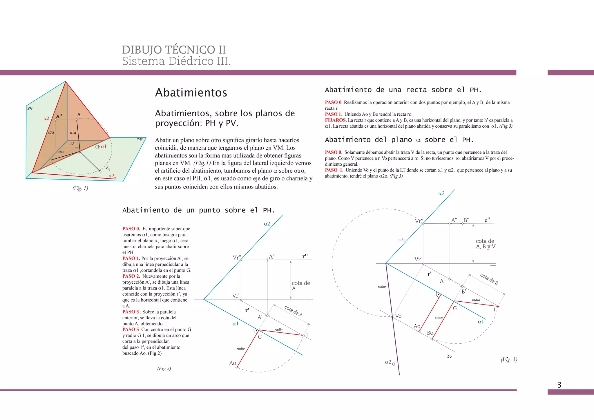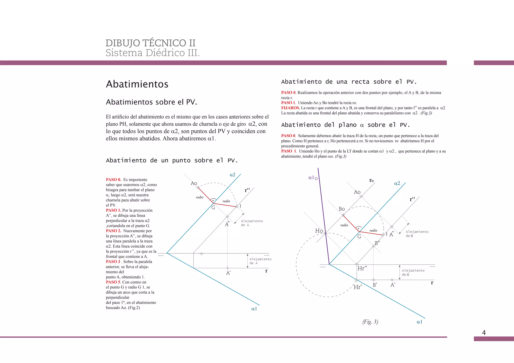 El documento explica los pasos para realizar abatimientos de puntos, rectas y planos sobre los planos de proyección (PH y PV) y sobre planos paralelos. Los abatimientos permiten obtener figuras planas en el sistema de proyección vertical mediante la rotación de elementos hasta hacerlos coincidir con los planos de proyección. Se describen procedimientos específicos para abatir elementos sobre cada uno de los planos mencionados.