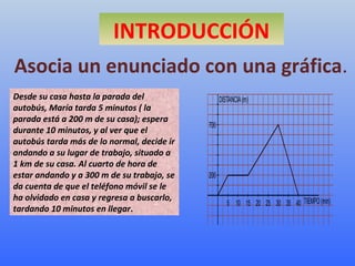 El documento describe el trayecto de María desde su casa hasta su lugar de trabajo, detallando los tiempos y distancias involucrados. También se introduce el concepto de funciones matemáticas mediante ejemplos analíticos y gráficos, incluyendo características de funciones específicas. Finalmente, se incluyen actividades de autoevaluación y bibliografía relacionada.