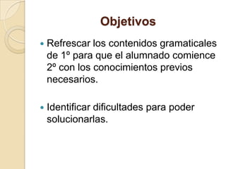 Este documento presenta una unidad didáctica para repasar los contenidos básicos de gramática de primero de bachillerato. El objetivo es refrescar los conocimientos previos de los estudiantes antes de comenzar segundo año. La unidad cubre temas como las clases de sintagmas, las locuciones, las perífrasis verbales, los complementos del verbo y las oraciones simples. Se divide en dos sesiones que analizan estos conceptos gramaticales a través de ejemplos y enlaces a recursos en línea.