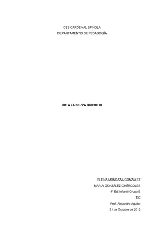 Este documento presenta una unidad didáctica de 5 días sobre los animales salvajes dirigida a alumnos de 4o de Educación Infantil. La unidad incluye 10 actividades que tienen como objetivo familiarizar a los niños con diferentes especies de animales salvajes y sus características, así como introducir el uso de las TIC. Algunas actividades propuestas son exponer lo que los niños ya saben sobre el tema, ver videos e imágenes de animales, elegir un animal favorito y buscar información sobre él, ver la película de